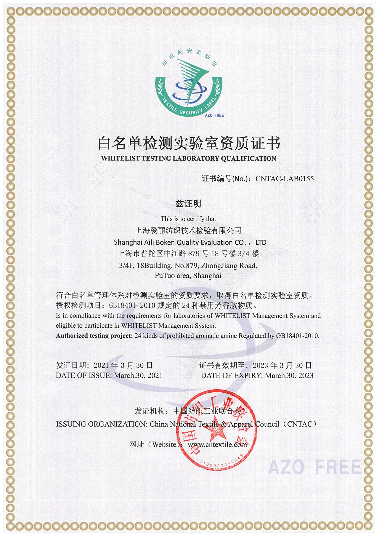 上海愛麗紡織技術検験有限公司は2013年3月に《ホワイトリスト資格》を取得致しました。